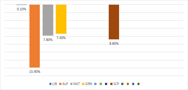 SCP preferences are split between the more extreme GRN and the more moderate ALP, with negligible preference flow to the other parties. This takes NAT out of its secure 3rd spot.