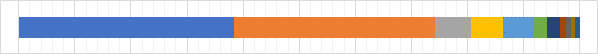 All of the first preferences are counted and the result shown above is achieved. On the top bar every major tick line is 10% and minors are 2%. The lower set in this step and each other going forward shows the % of the whole which is not yet assigned. Note; colours do not match with typical party colours from the example to avoid visual bias and improve visual clarity.
