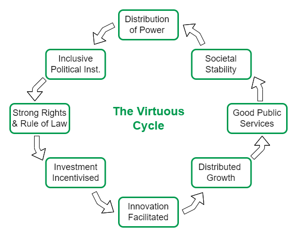 This virtuous cycle creates a positive feedback loop, where improvements in governance lead to economic enhancements that further strengthen political and social structures, promoting sustained development and prosperity.